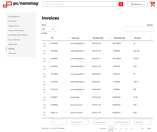 This tab will display your invoices for orders placed on pcnametag.com or via the contact center.